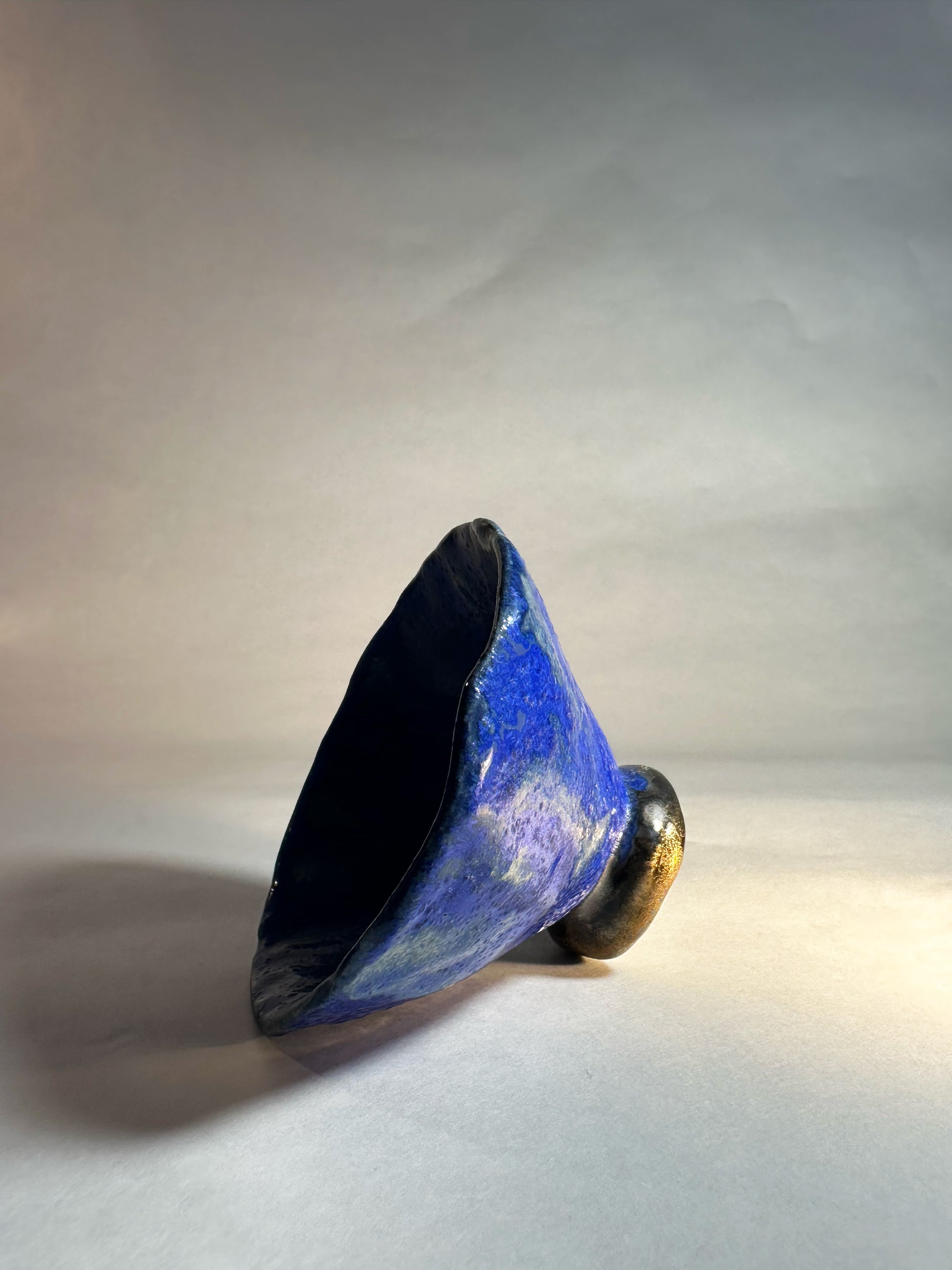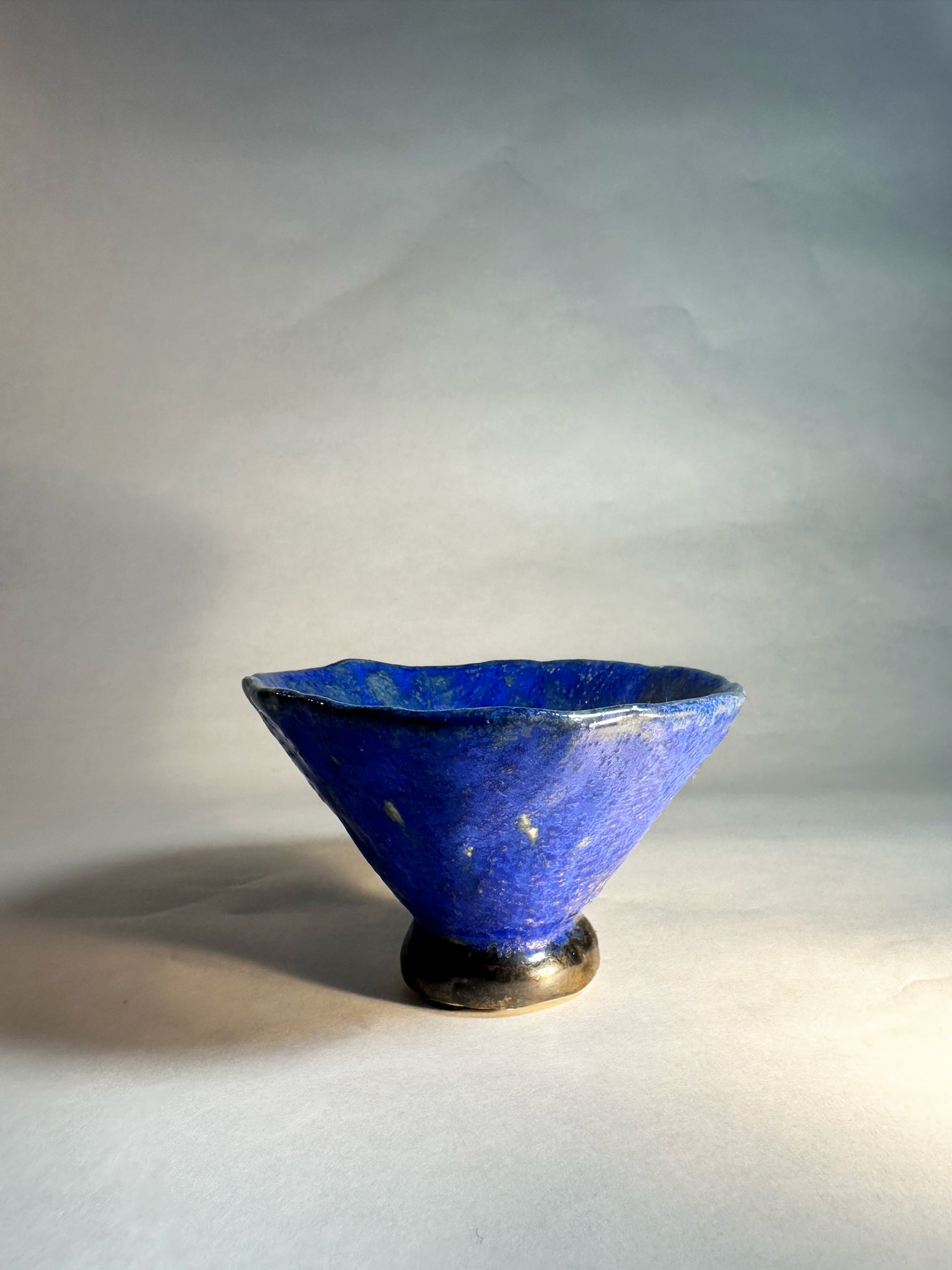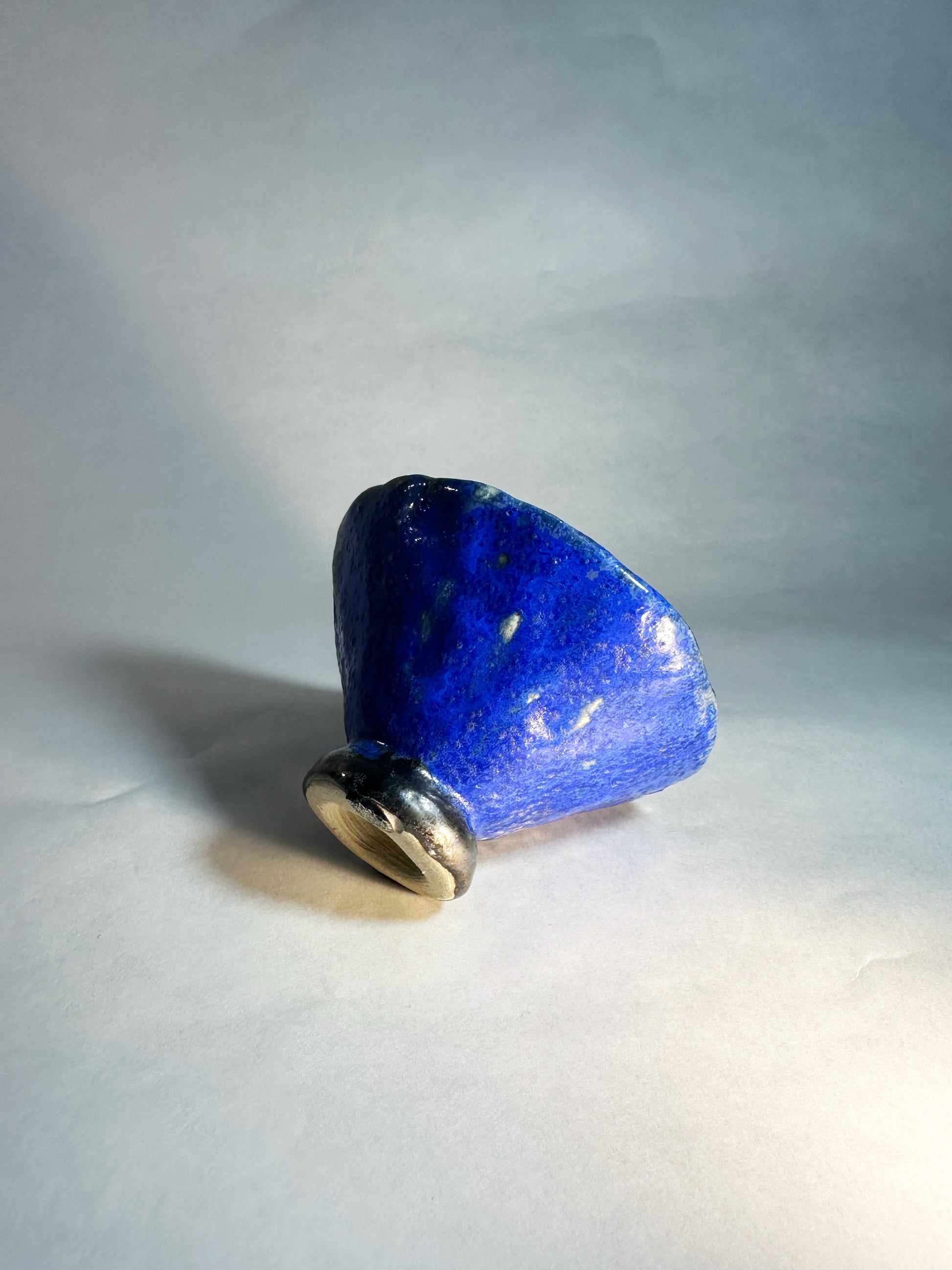 Ce bol en grès blanc, façonné selon une technique artisanale de modelage, capte le regard par l’intensité de son bleu et l’éclat délicat de son pied métallisé. Une pièce unique, à la fois brute et raffinée, pensée pour sublimer les instants du quotidien.